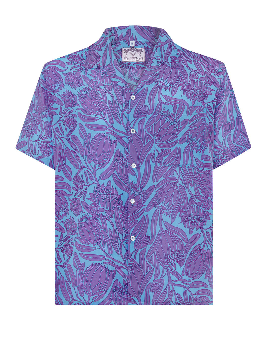 This sumptuous violet and turquoise floral print was inspired by the magnificent King Proteas that are found boldly blooming in the Abbey Gardens on the island of Tresco in the Isles of Scilly.