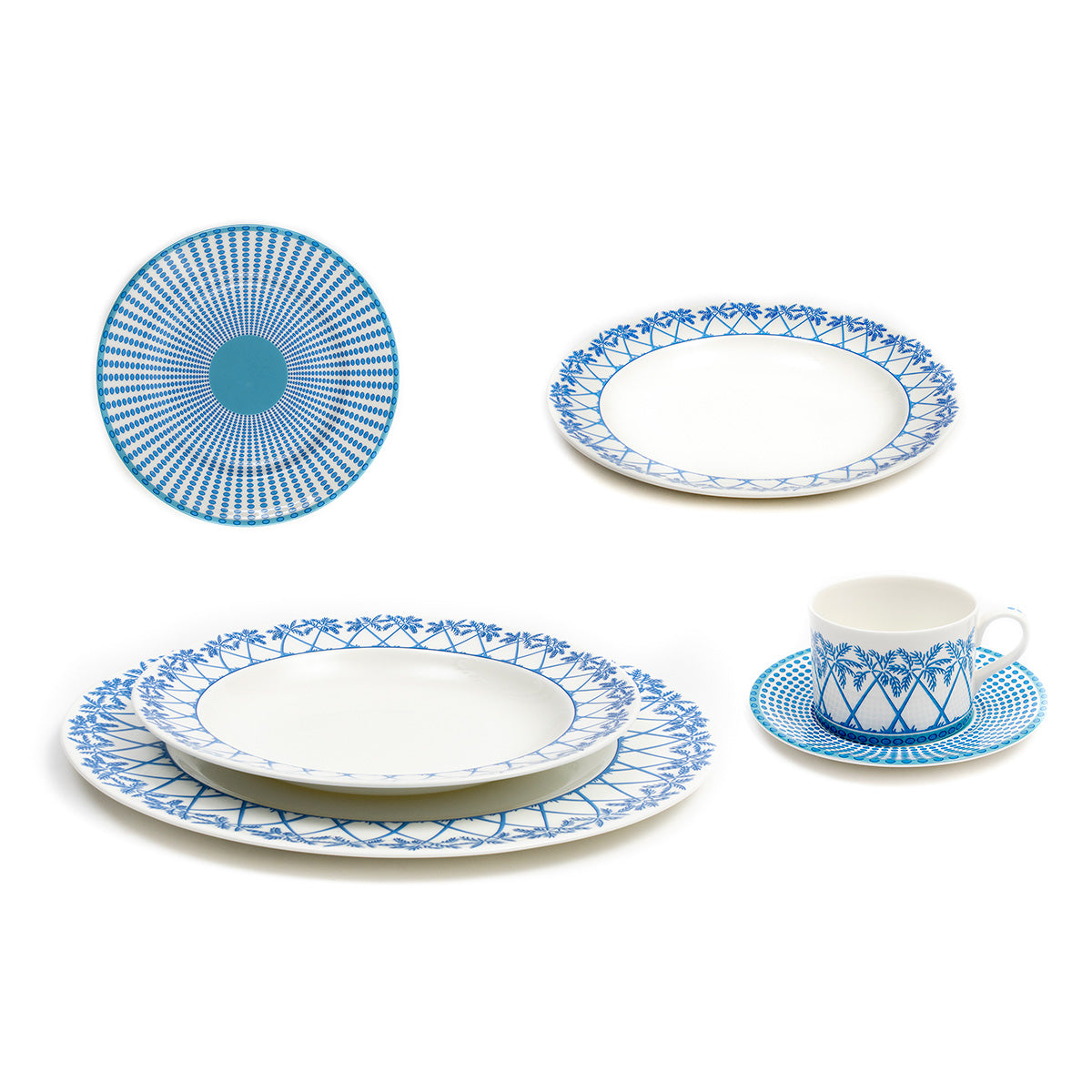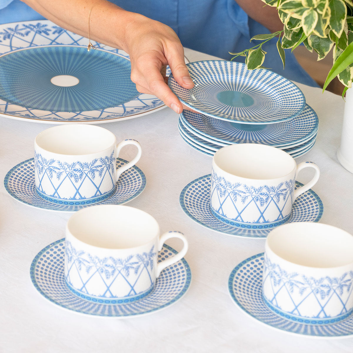 This elegant fine bone china dinner service is edged by a lattice of crossed palms and coconuts bringing a taste of the exotic tropics to your table. The design is inspired by the tapestry of palms on Mustique and the beautiful blue waters surrounding the island.