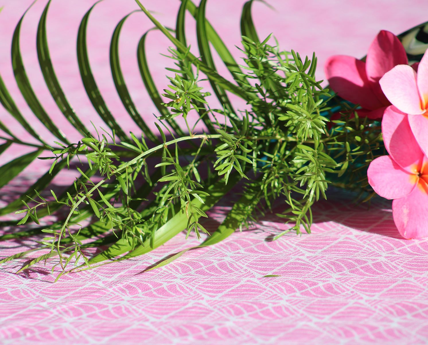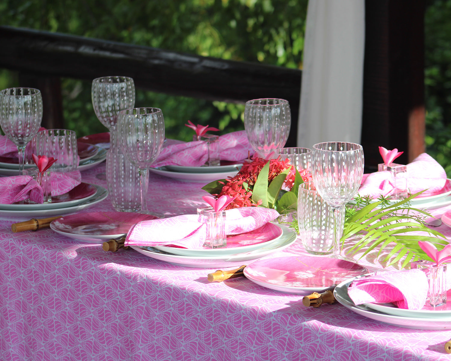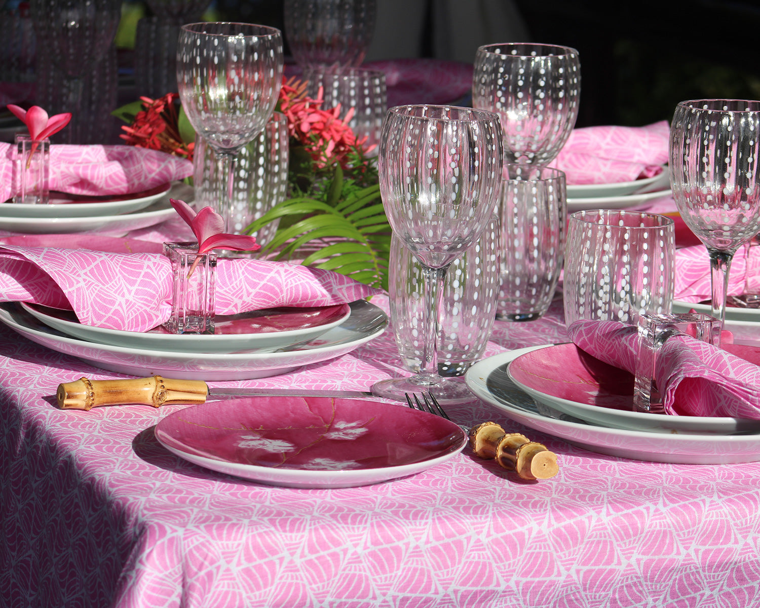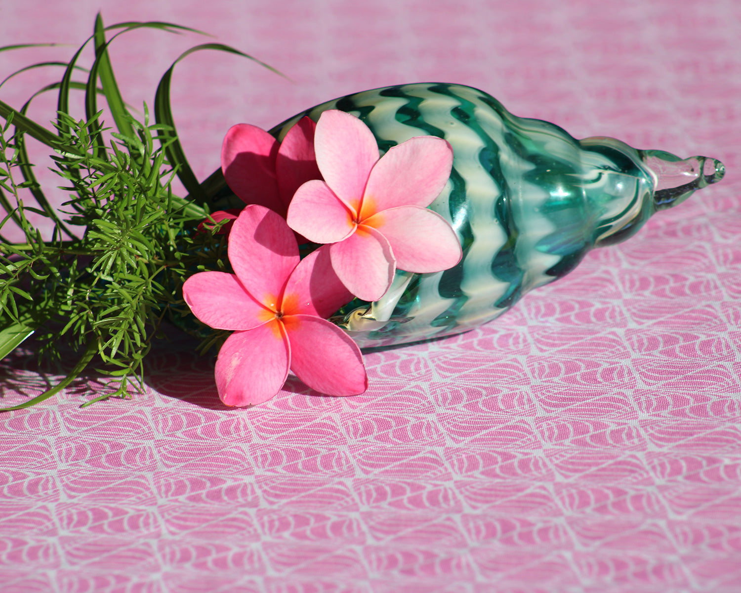 As you walk along the beaches of Mustique, if you look closely enough, you’ll see tiny shells half covered by sand. It’s the tops of these shells peeking out from the sand that inspired Lotty to design this graphic repeat print and it works beautifully on our table linen.
