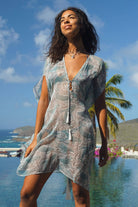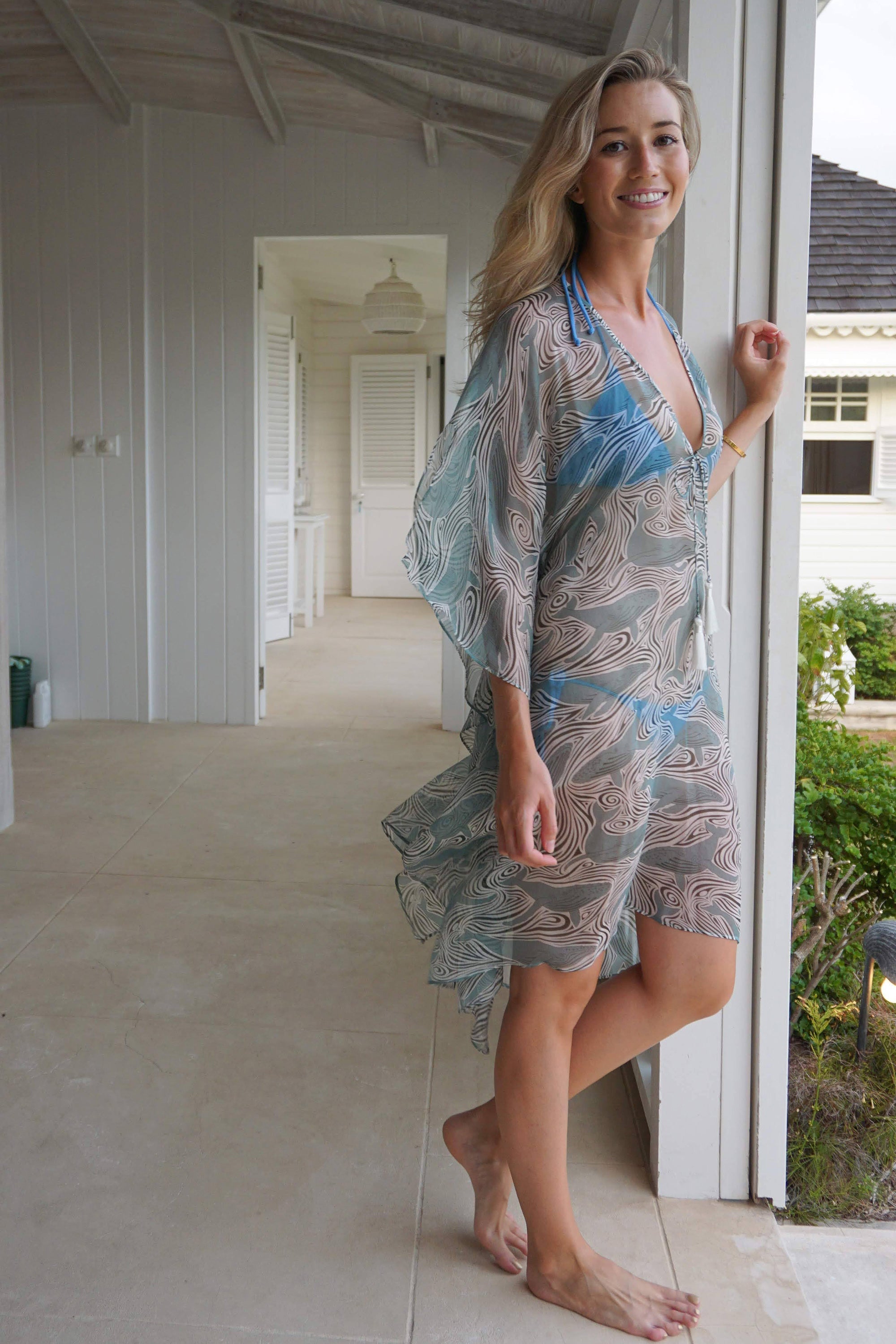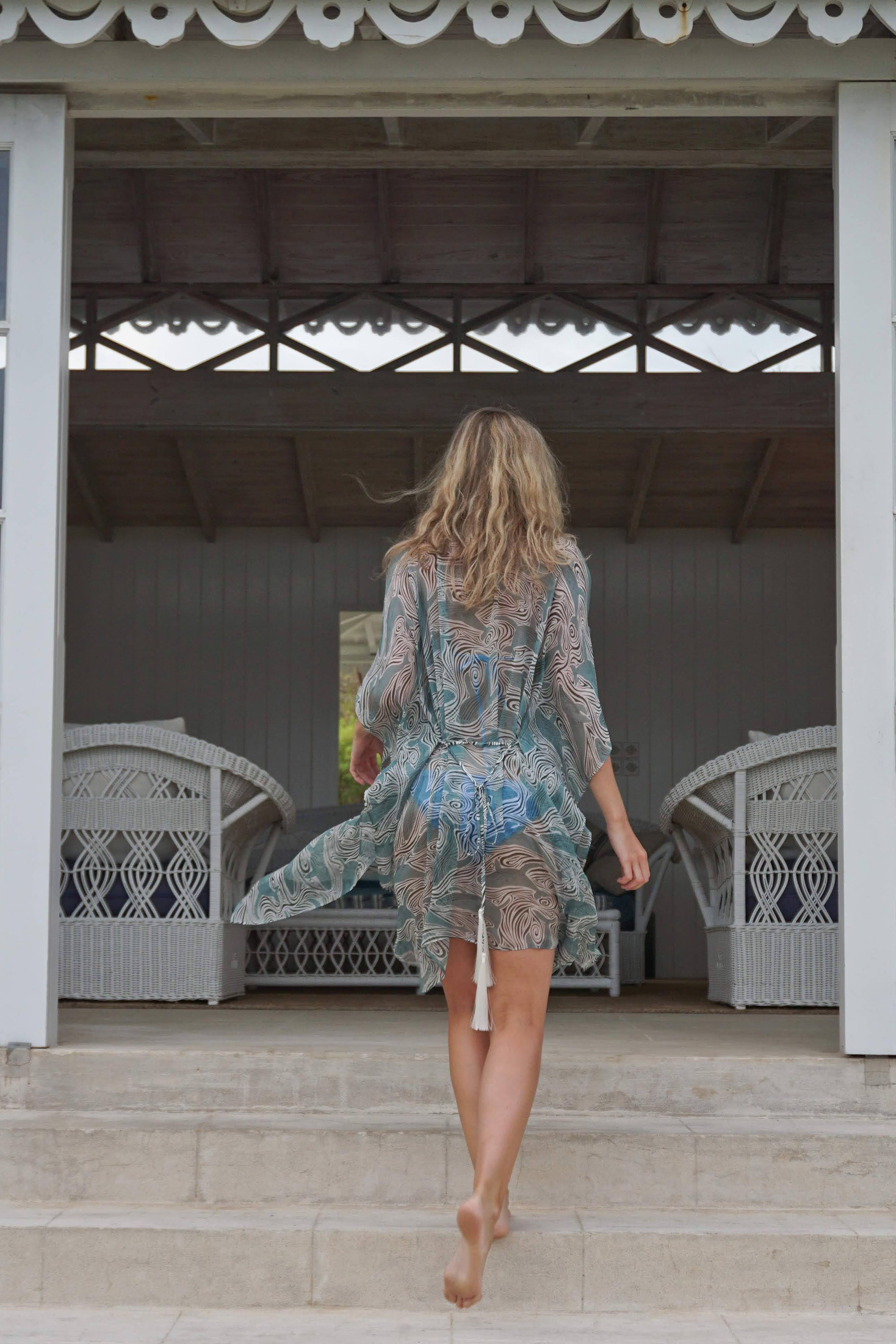 Short, sweet and seductive, the Cosima kaftan is made of translucent silk chiffon with a deep V neckline and square hand rolled & hemmed handkerchief hem that falls to above the knee. Wear loose for the beach or tie in front or behind, using the silk tasseled string, for a more defined waist.