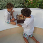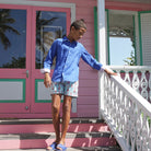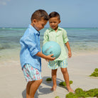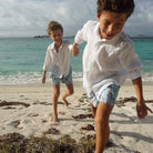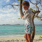Riva print depicts iconic little speedboats pootling up and down turquoise blue waters. The perfect pair of swim shorts for boys who like their toys! This is a busy print that goes well together with a plain linen shirt in a nautical blue or white.