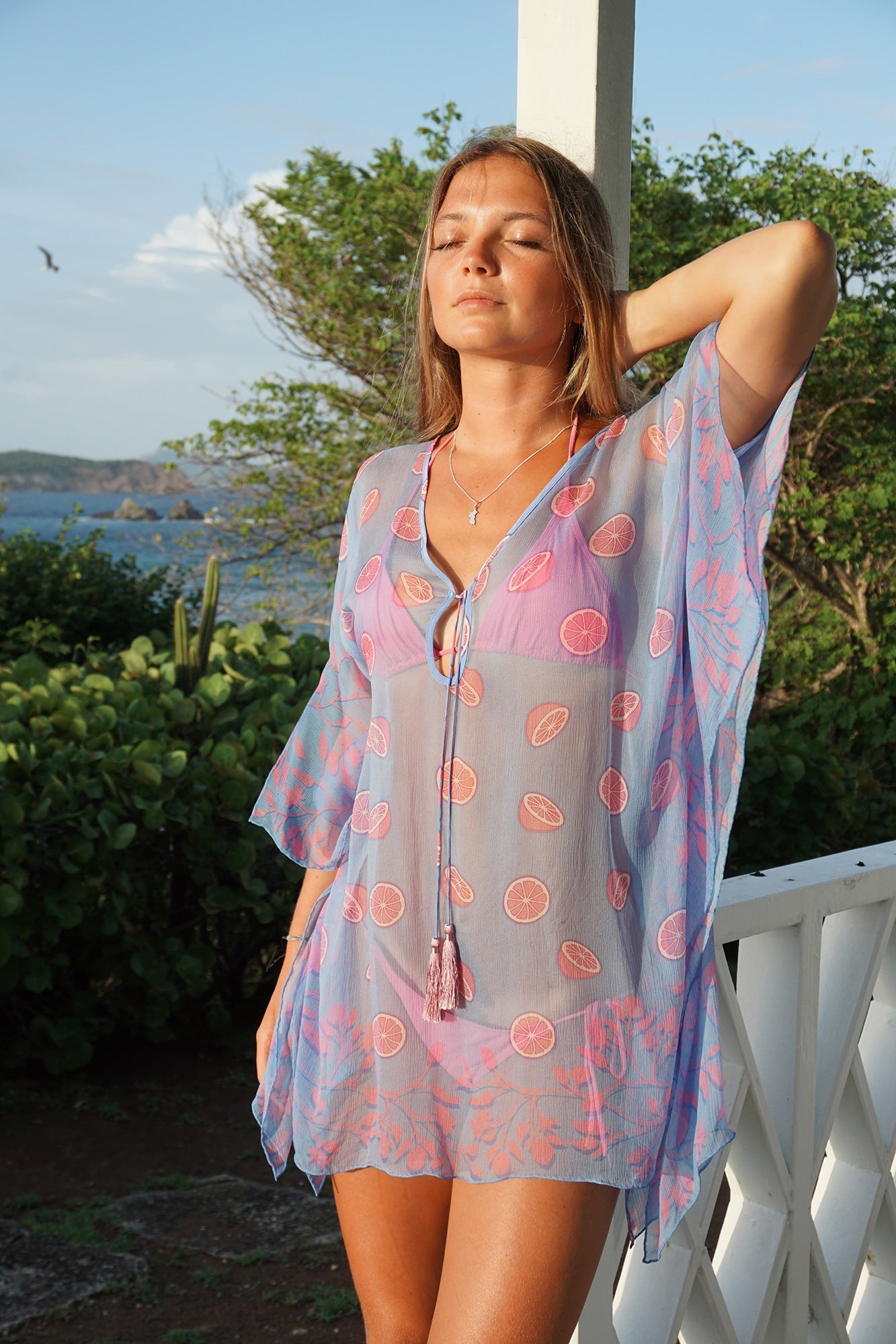 Short, sweet and seductive, the Cosima kaftan is made of translucent silk chiffon with a deep V neckline and square hand rolled & hemmed handkerchief hem that falls to above the knee. Wear loose for the beach or tie in front or behind, using the silk tasselled strings, for a more defined waist.