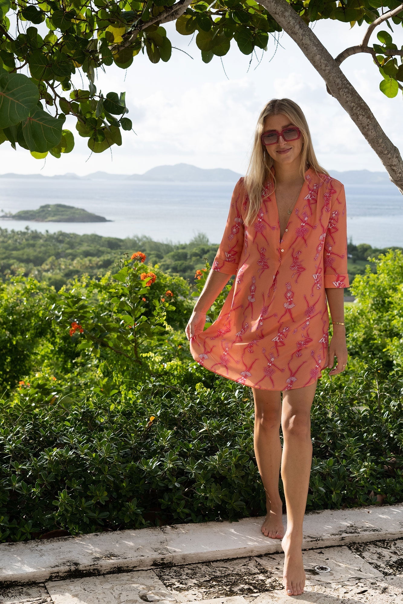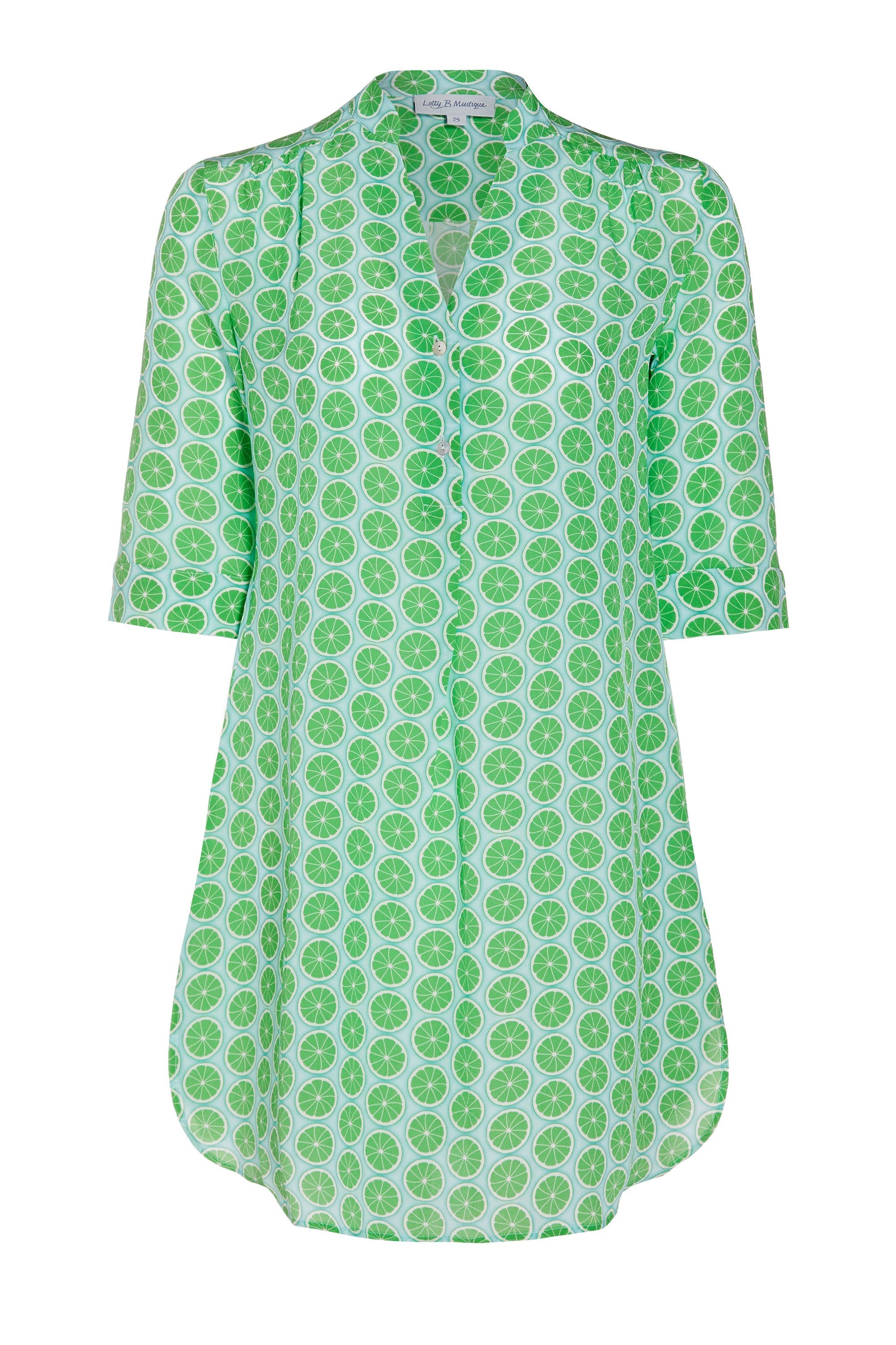 A Pink House favorite, the Decima dress is a comfortable, loose and breezy style featuring an open V neckline with an elegant mandarin collar and 3/4 length sleeves.
