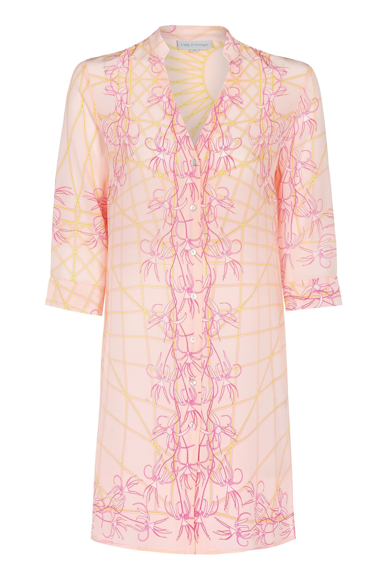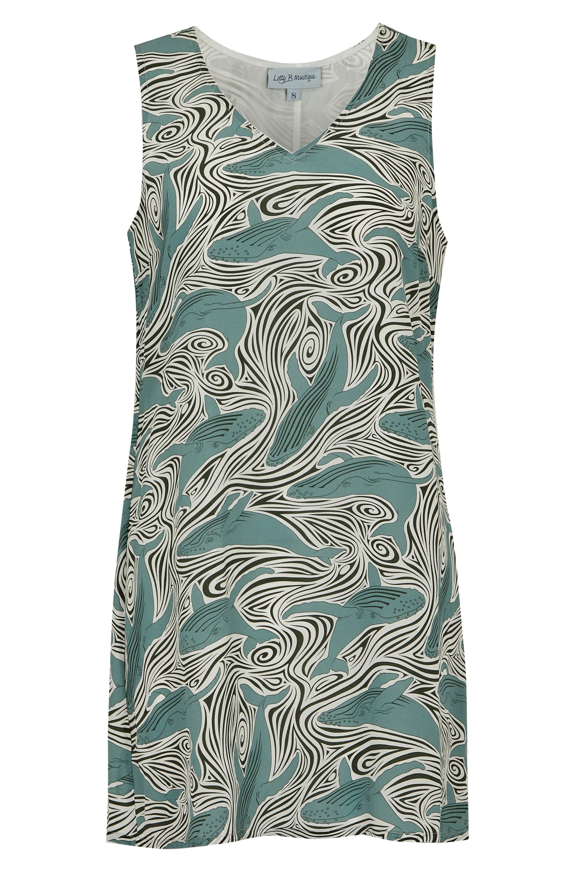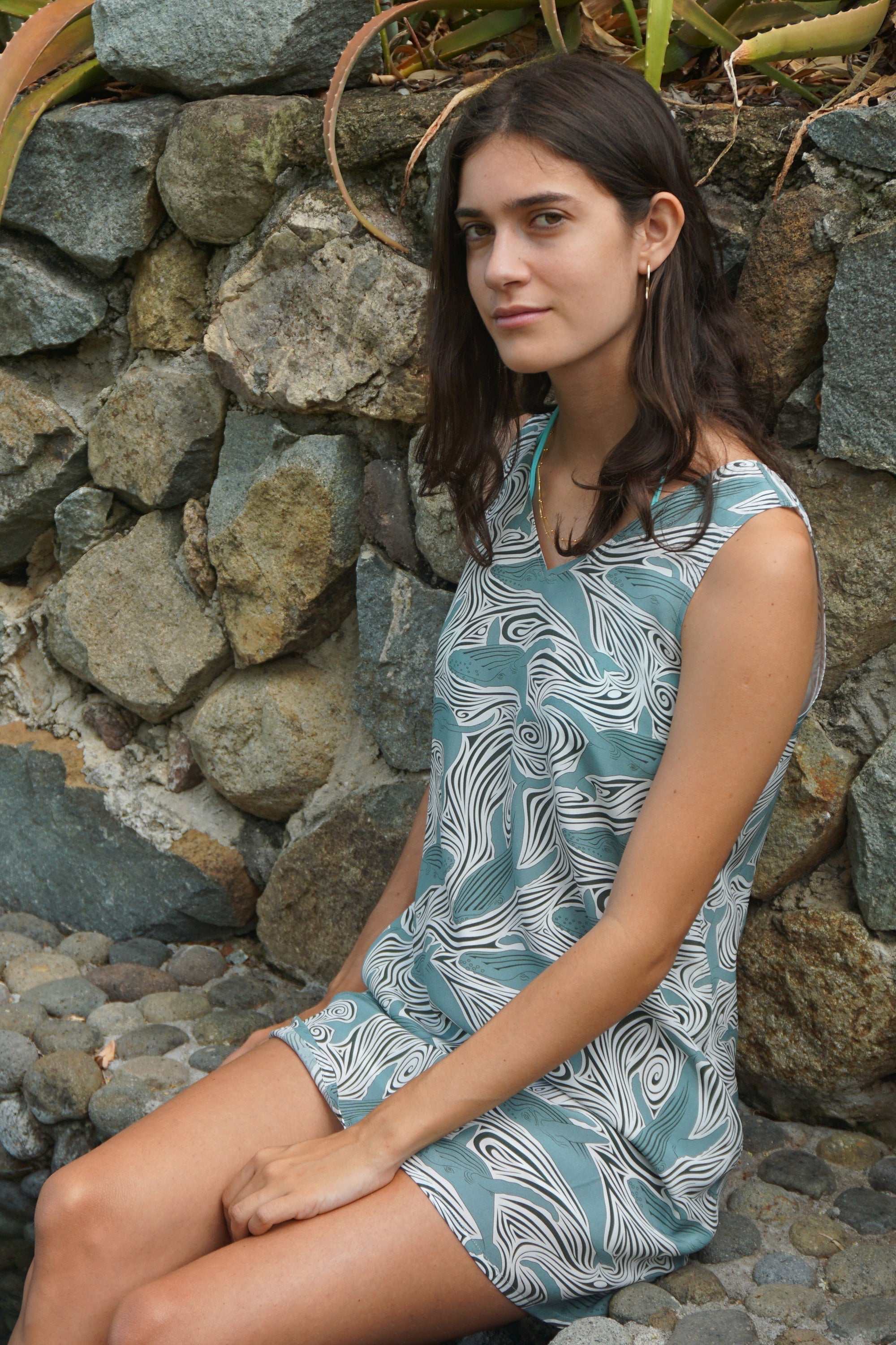 A Pink House favorite, the Decima dress is a comfortable, loose and breezy style featuring an open V neckline with an elegant mandarin collar and 3/4 length sleeves.