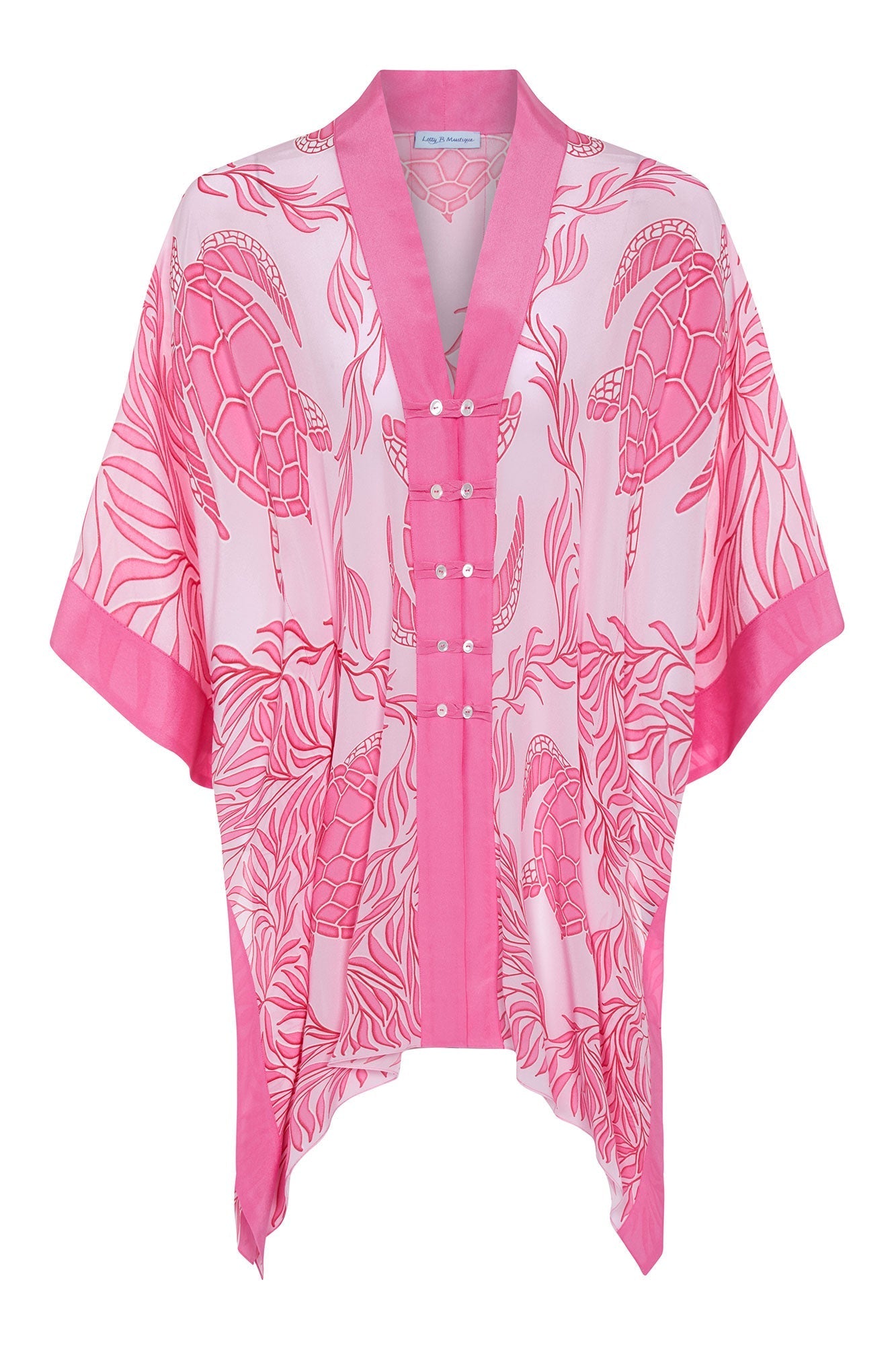 Screen-printed onto lightweight, silk crepe-de-chine and edged to the sides and down the center back with plain pink, we love the elegant, double rouleau fastenings on the flat shawl-style lapels.
