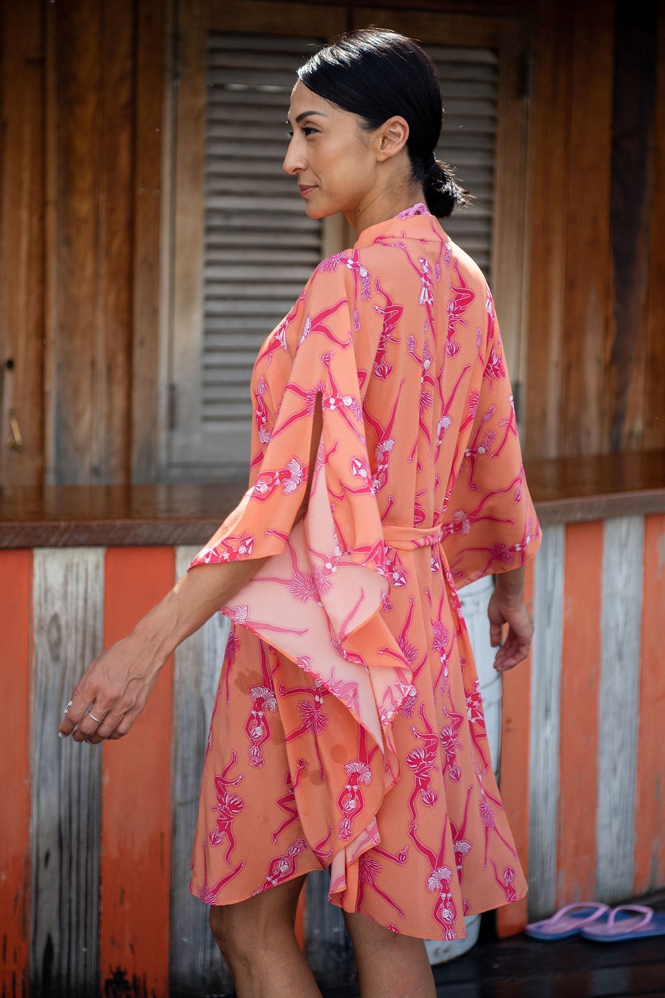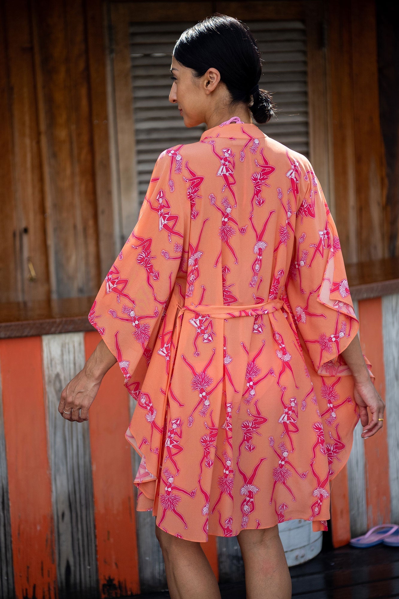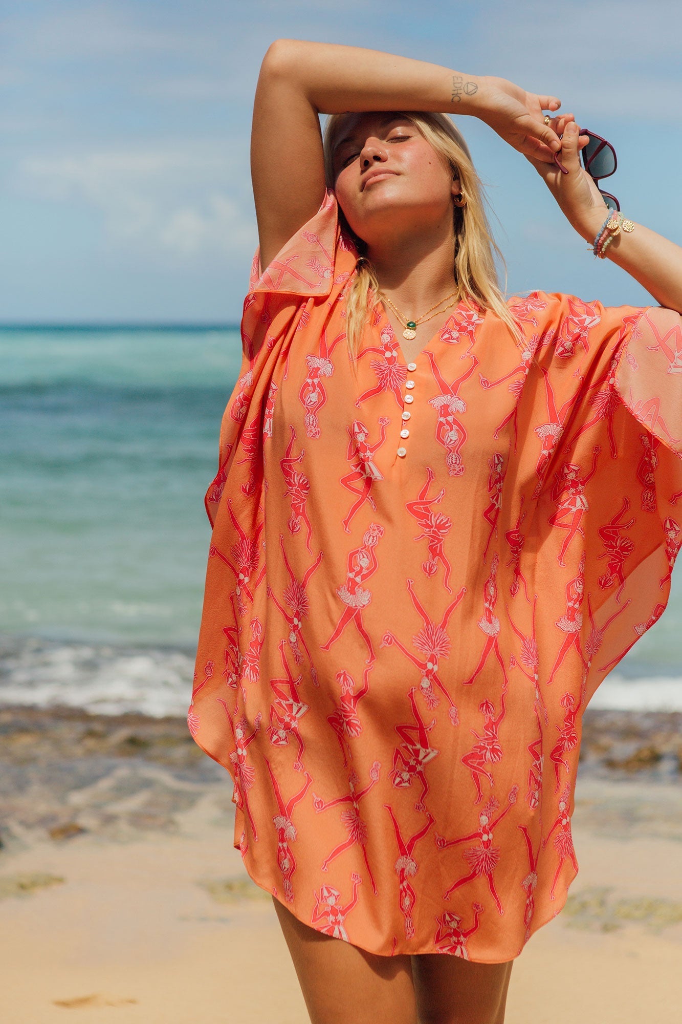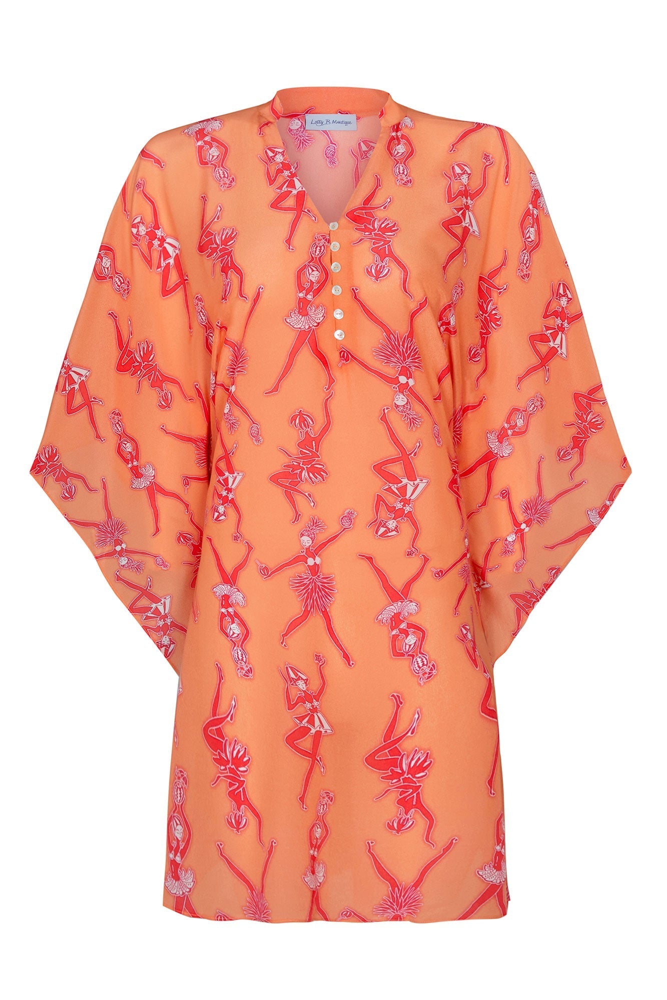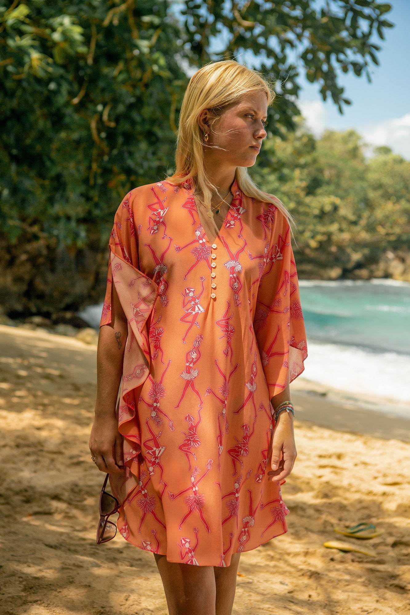 The "Lotty" kaftan features a short Nehru style collar and deep V neckline fastened with an elegant line of 6 little mother of pearl buttons. Wear loose over a bikini or tie in with the accompanying silk belt to transform to a short tunic style dress.