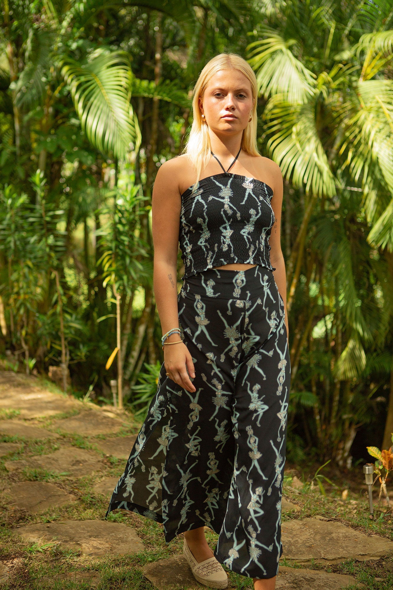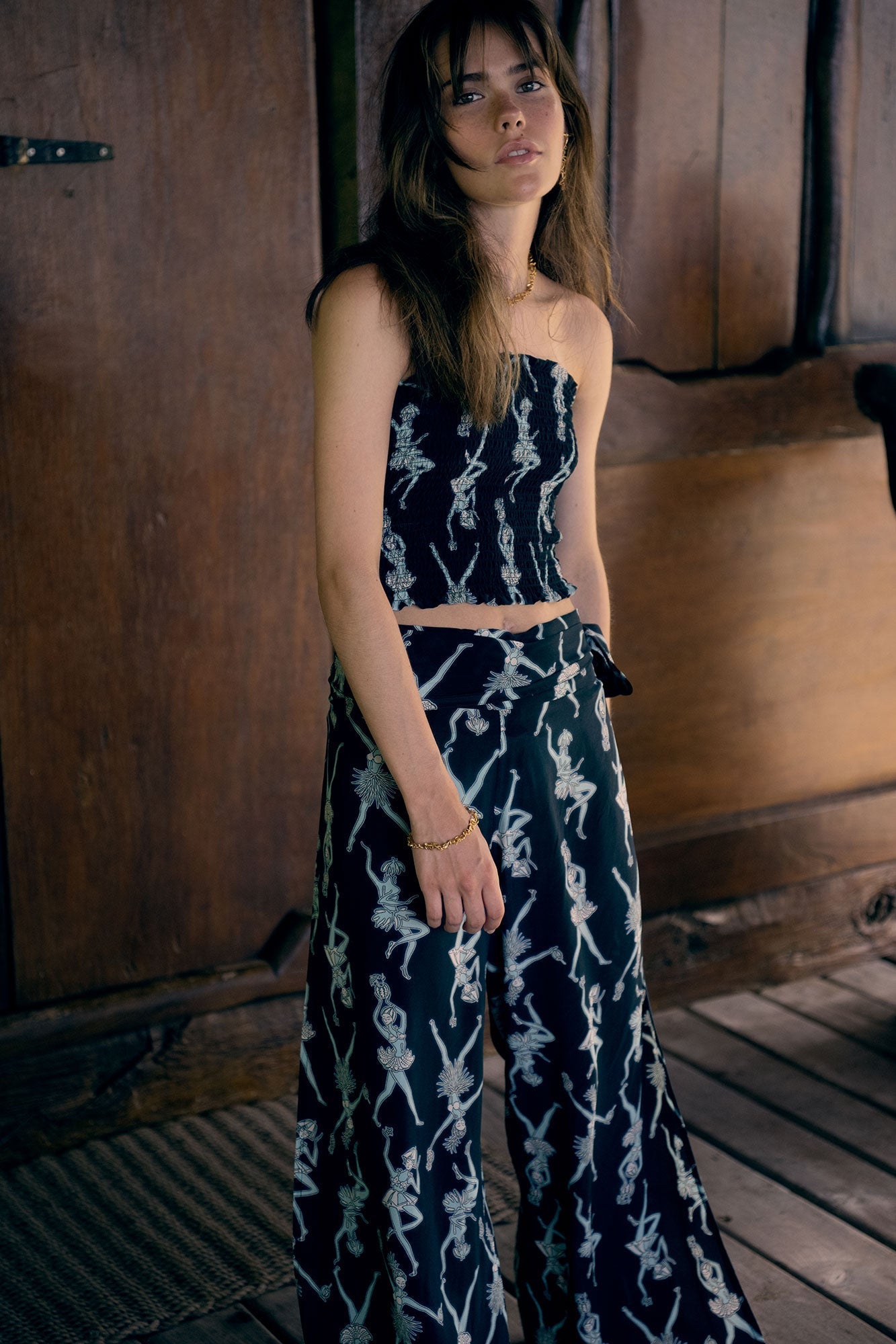 We love these flowing, wrap-around silk palazzo pants. Pair with a matching Kim blouse loosely tucked in for a sensational occasionwear outfit, or go for a boho beach look with a shirred Fruit Punch bandeau top.