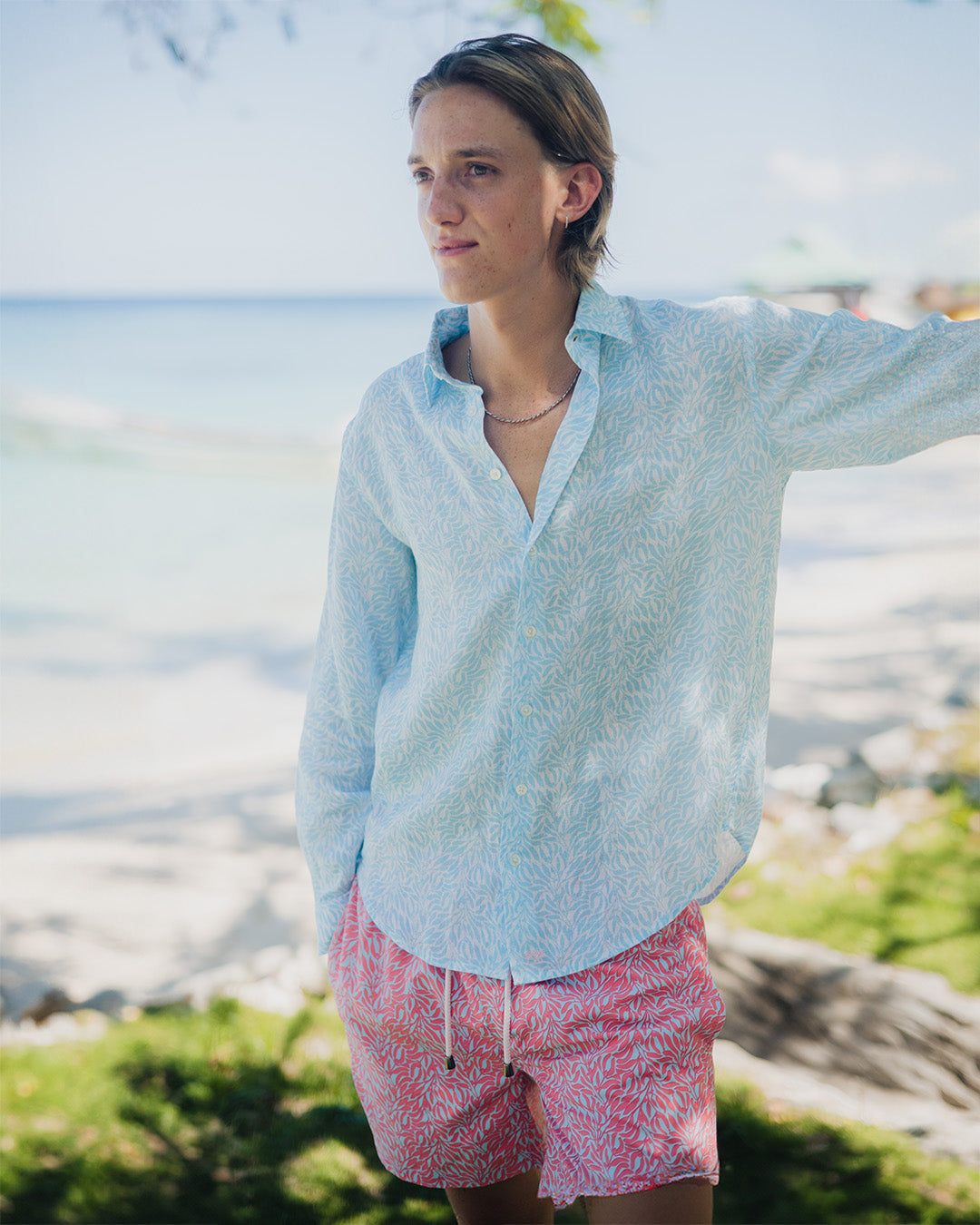 Lotty created her first sealeaf design some years ago and the flowing, beautiful strands are featured in this glorious printed linen shirt in a blue that is truly evocative of the Caribbean.