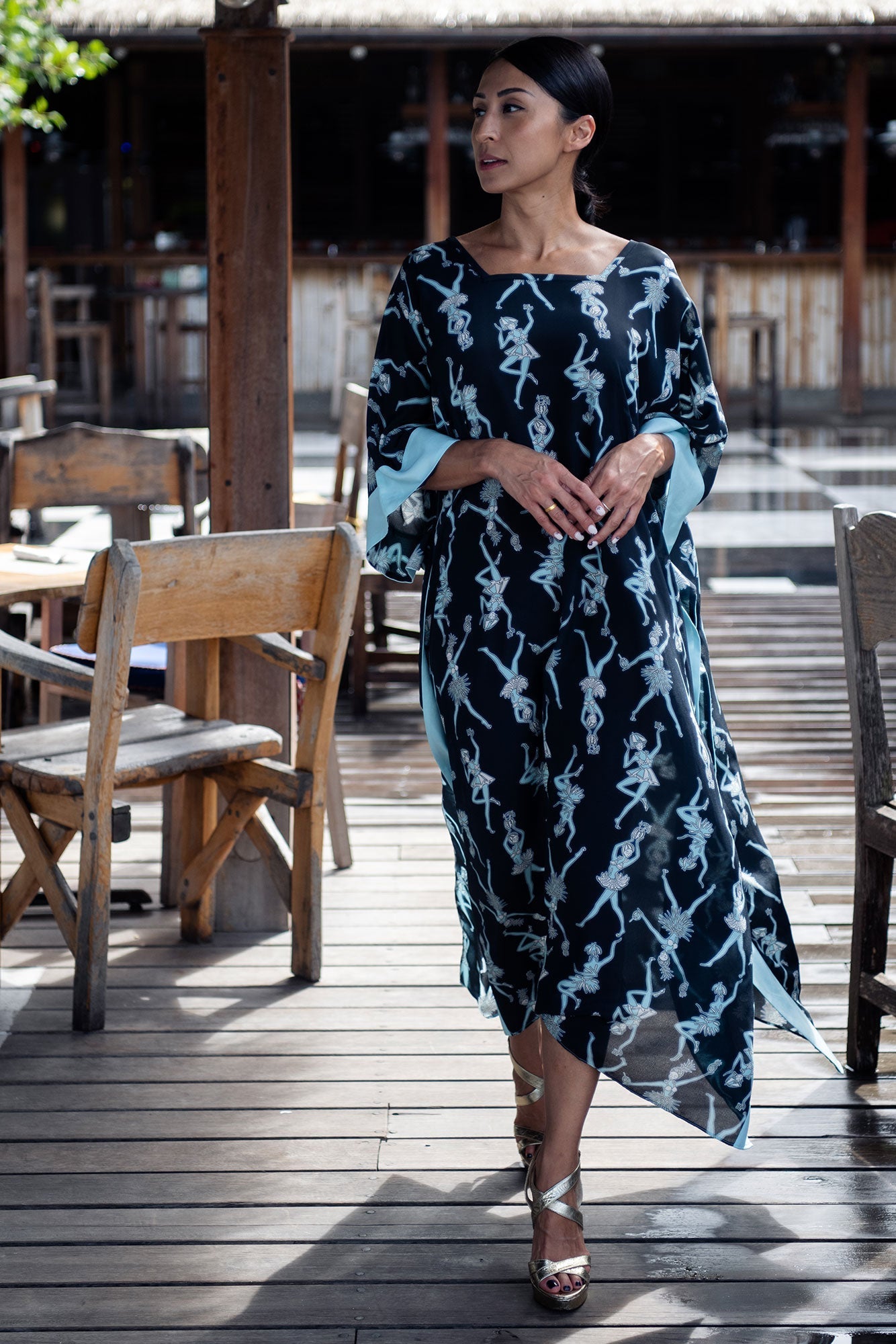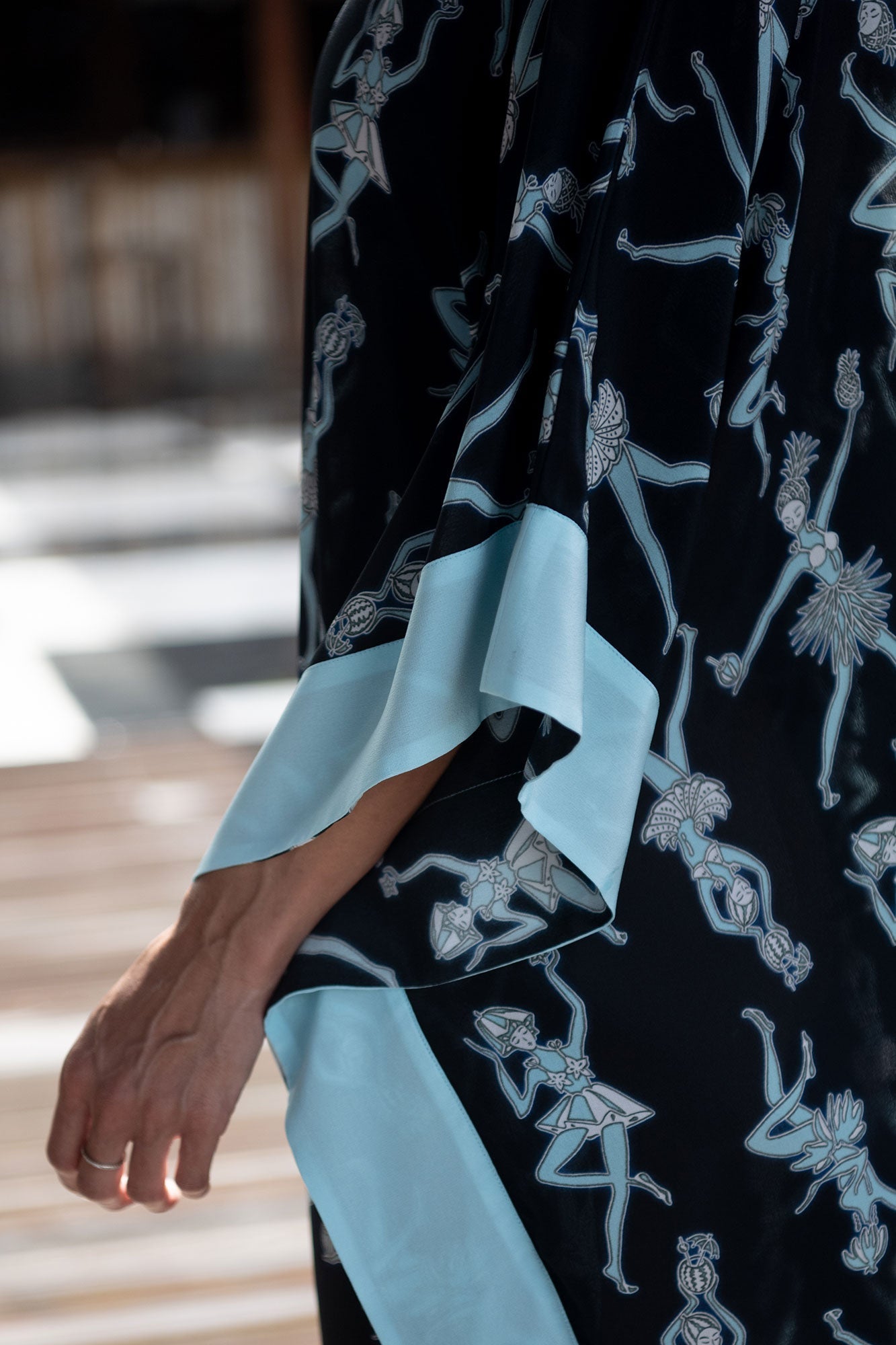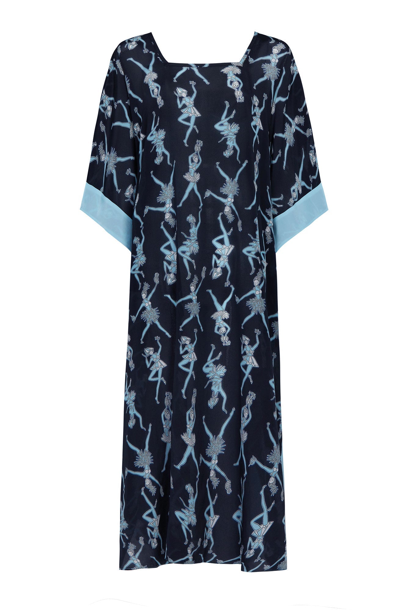 This "Fruit Punch" print has a fun history, originating from designs Lotty painted for a legendary Mustique New Year's party and features dancing silhouettes in four cocktail themed fancy dress outfits shimmying the night away. Screen printed onto luxurious crepe-de-chine silk and edged with a solid, pale blue border from shoulder to ankle, this style opens into a square neckline. The full-length, flowing silk allows the beautiful print speaks for itself.