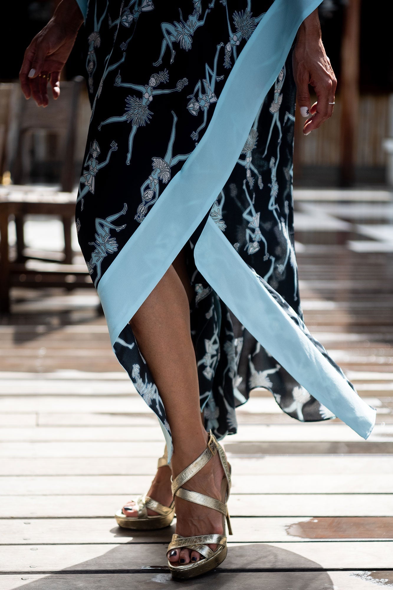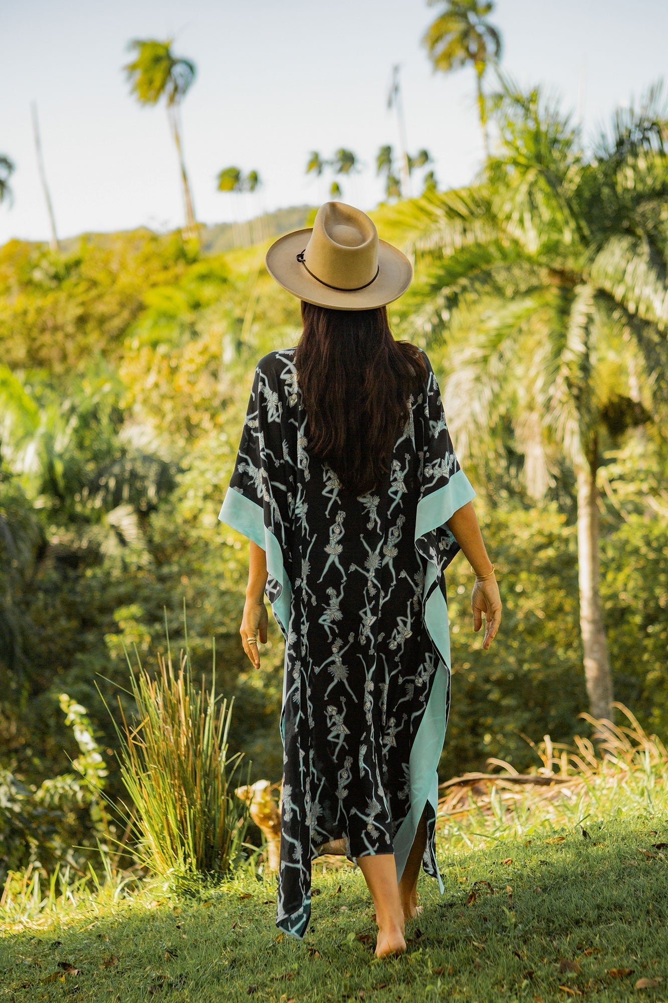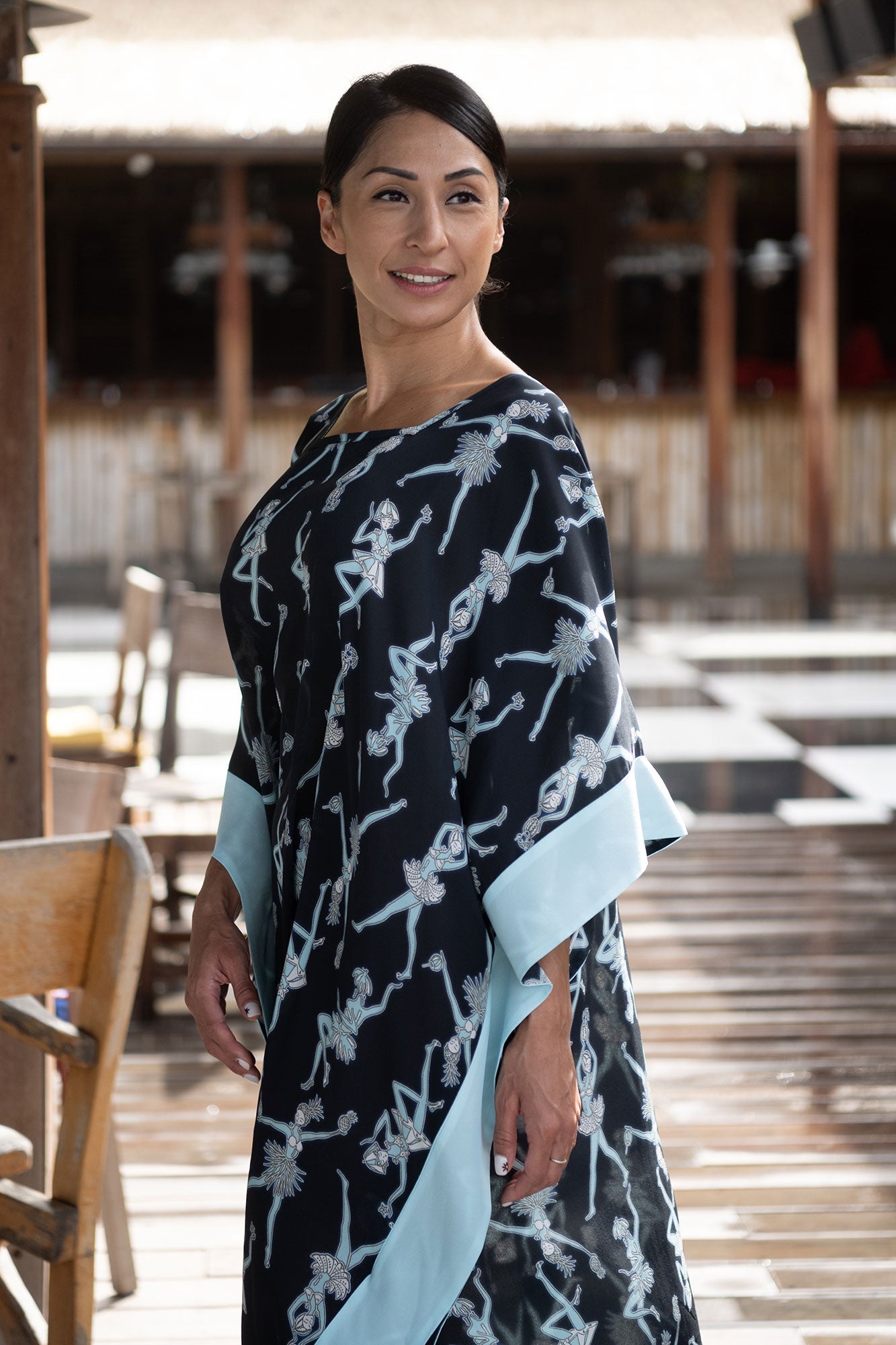 This "Fruit Punch" print has a fun history, originating from designs Lotty painted for a legendary Mustique New Year's party and features dancing silhouettes in four cocktail themed fancy dress outfits shimmying the night away. Screen printed onto luxurious crepe-de-chine silk and edged with a solid, pale blue border from shoulder to ankle, this style opens into a square neckline. The full-length, flowing silk allows the beautiful print speaks for itself.